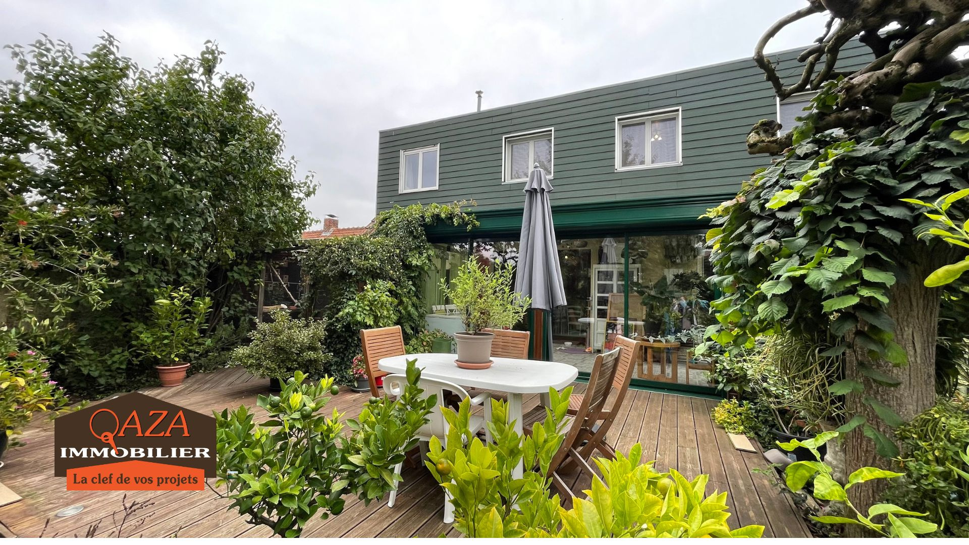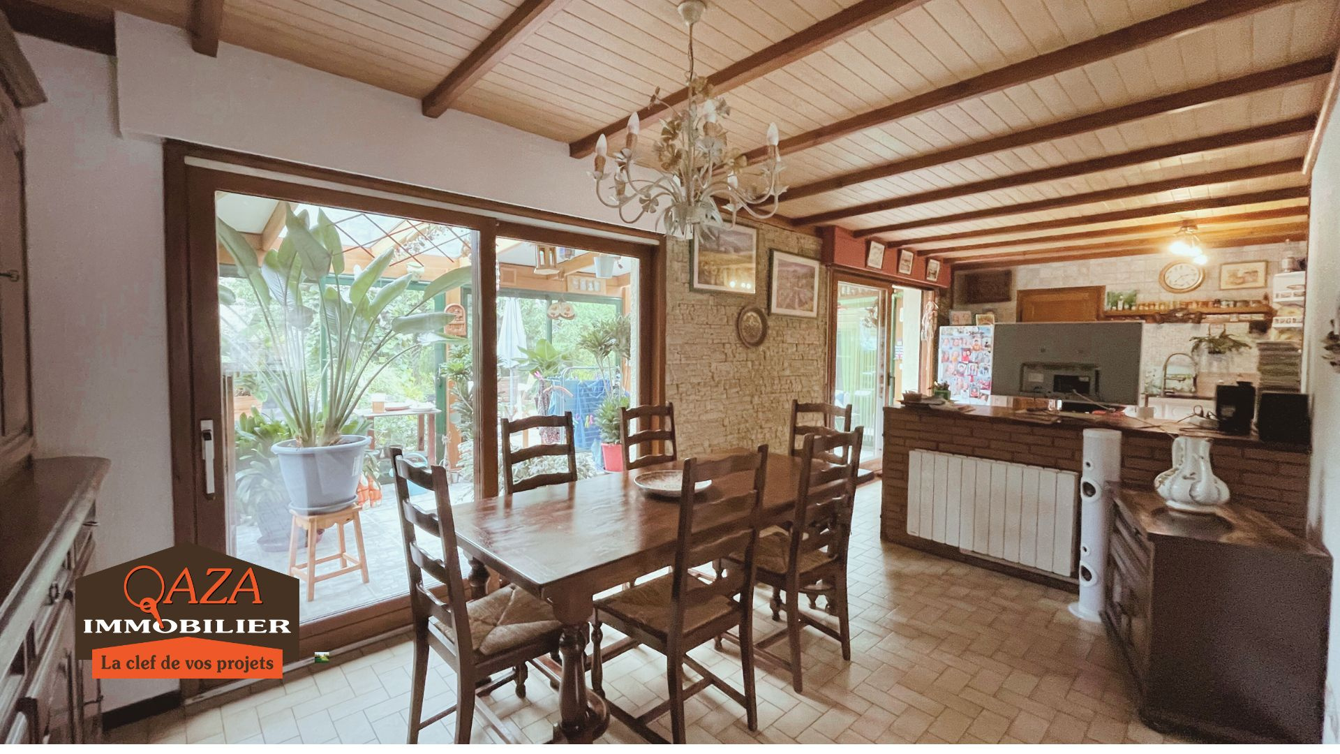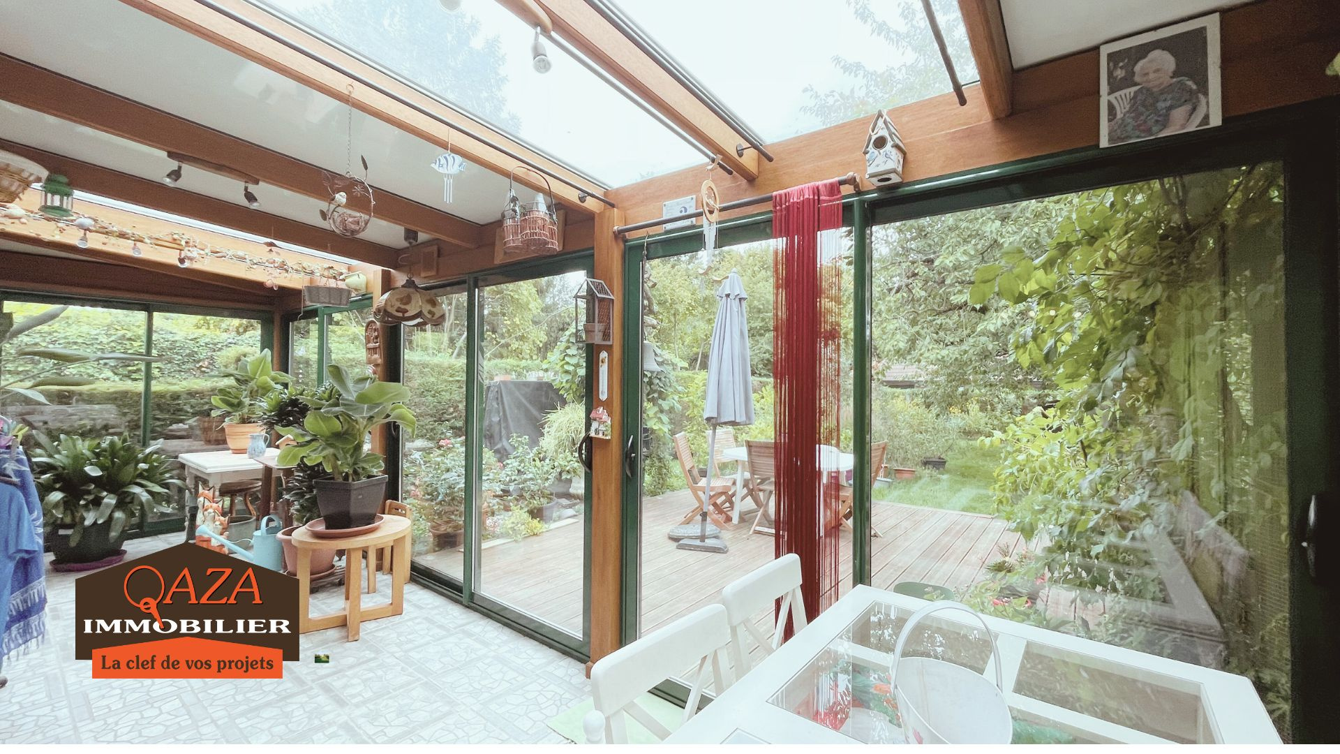 Belle véranda de plus de 20m² donnant sur le jardin arboré bien exposé.