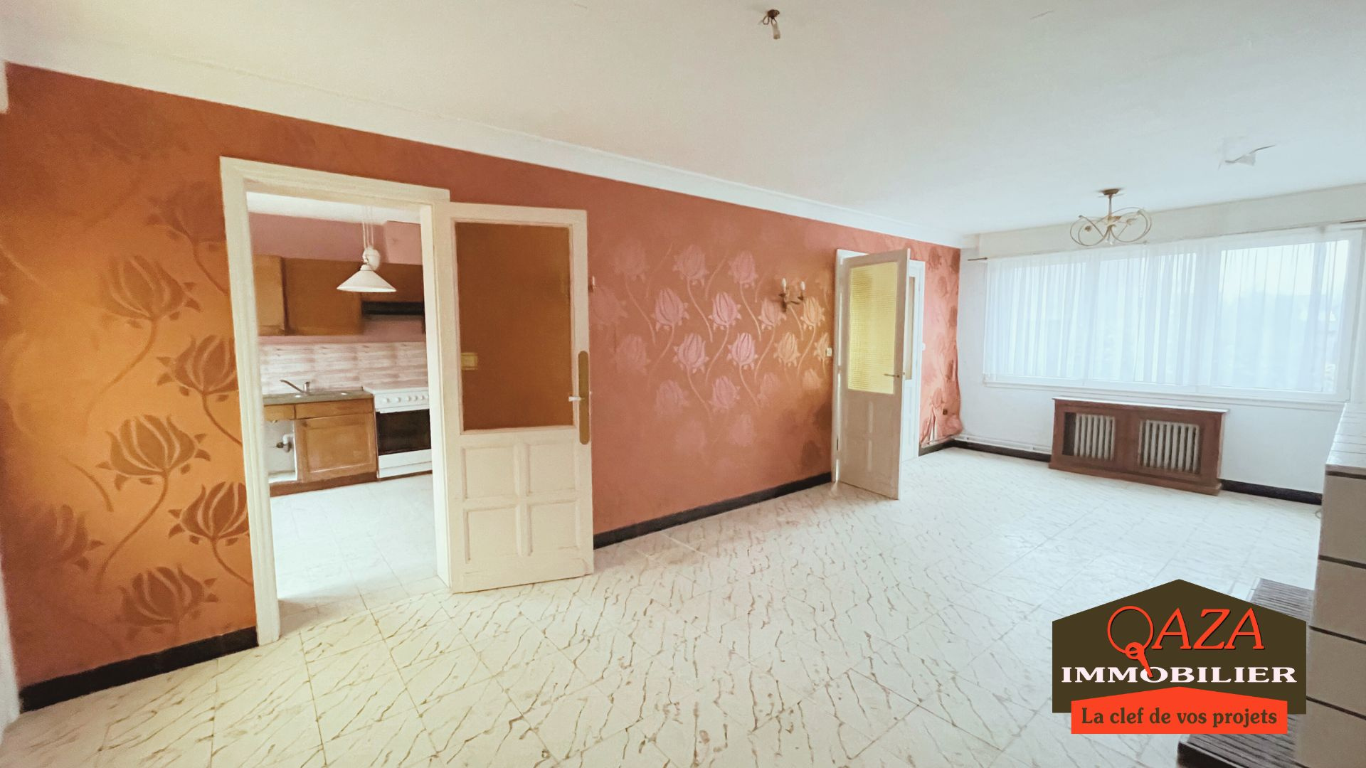 Hall, salon / séjour de 27m², cuisine séparée.