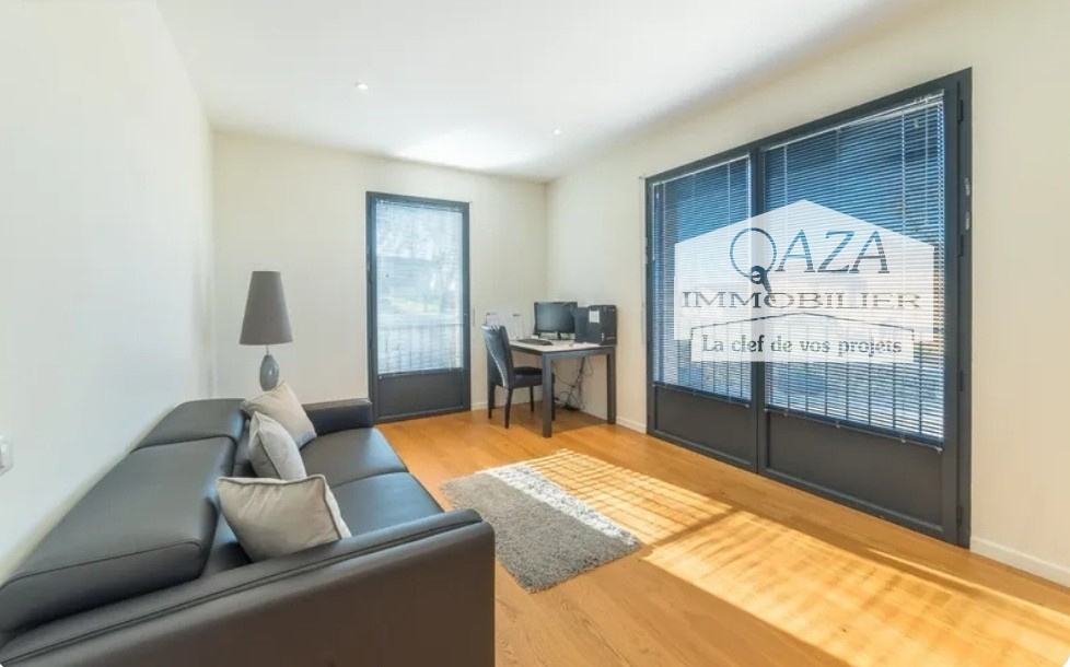 Une belle pièce de vie de 60 m² avec accès à la terrasse couverte donnant sur un jardin, cuisine entièrement équipée avec cellier.